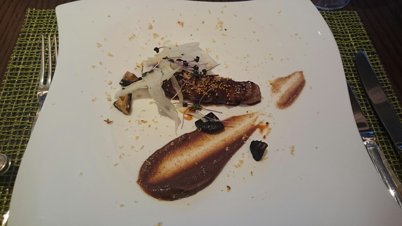 メインは「鴨胸肉のグラッセ デーツのピューレと椎茸のピクルス クルミとシードのフリット」。